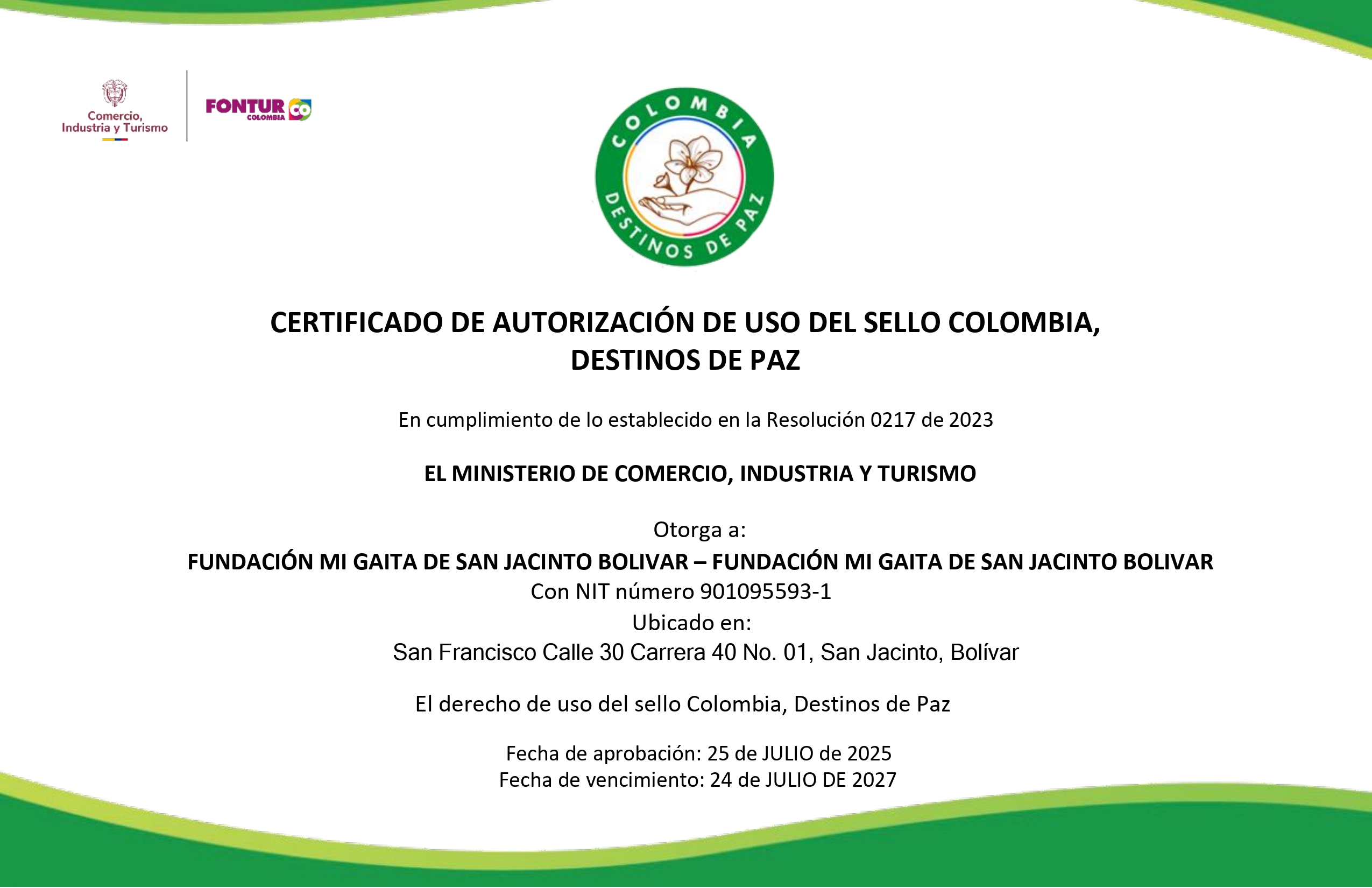 La Fundación Mi Gaita de San Jacinto, Bolívar cuenta con el Certificado de Autorización de Uso del Sello “Colombia, Destinos de Paz”, otorgado por el Ministerio de Comercio, Industria y Turismo, en cumplimiento de la Resolución 0217 de 2023.